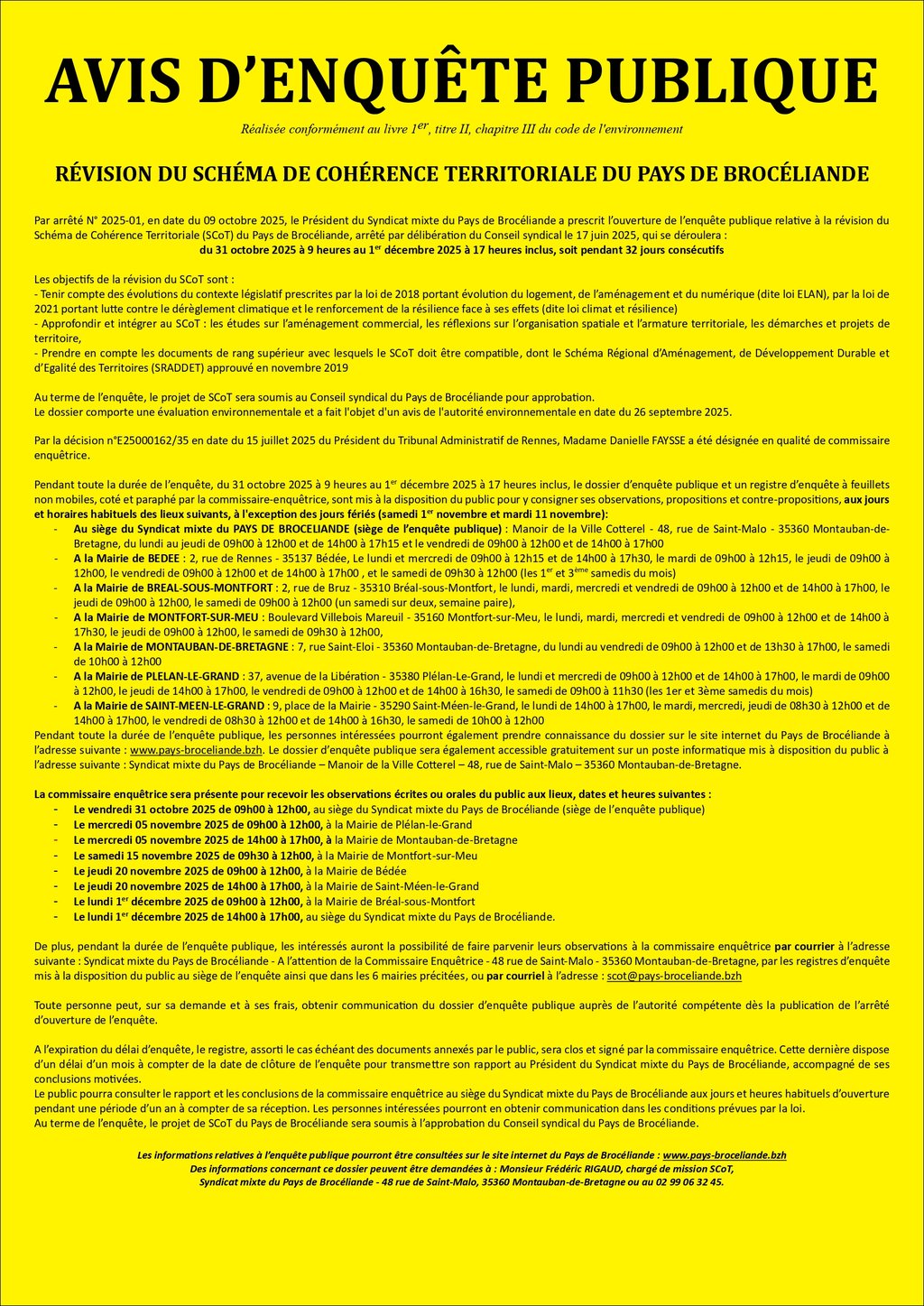 Jusqu’au lundi 1er décembre 2025, une enquête publique est ouverte pour recueillir leurs questions et propositions au sujet du prochain Schéma de Cohérence Territoriale (SCoT) du Pays de Brocéliande.